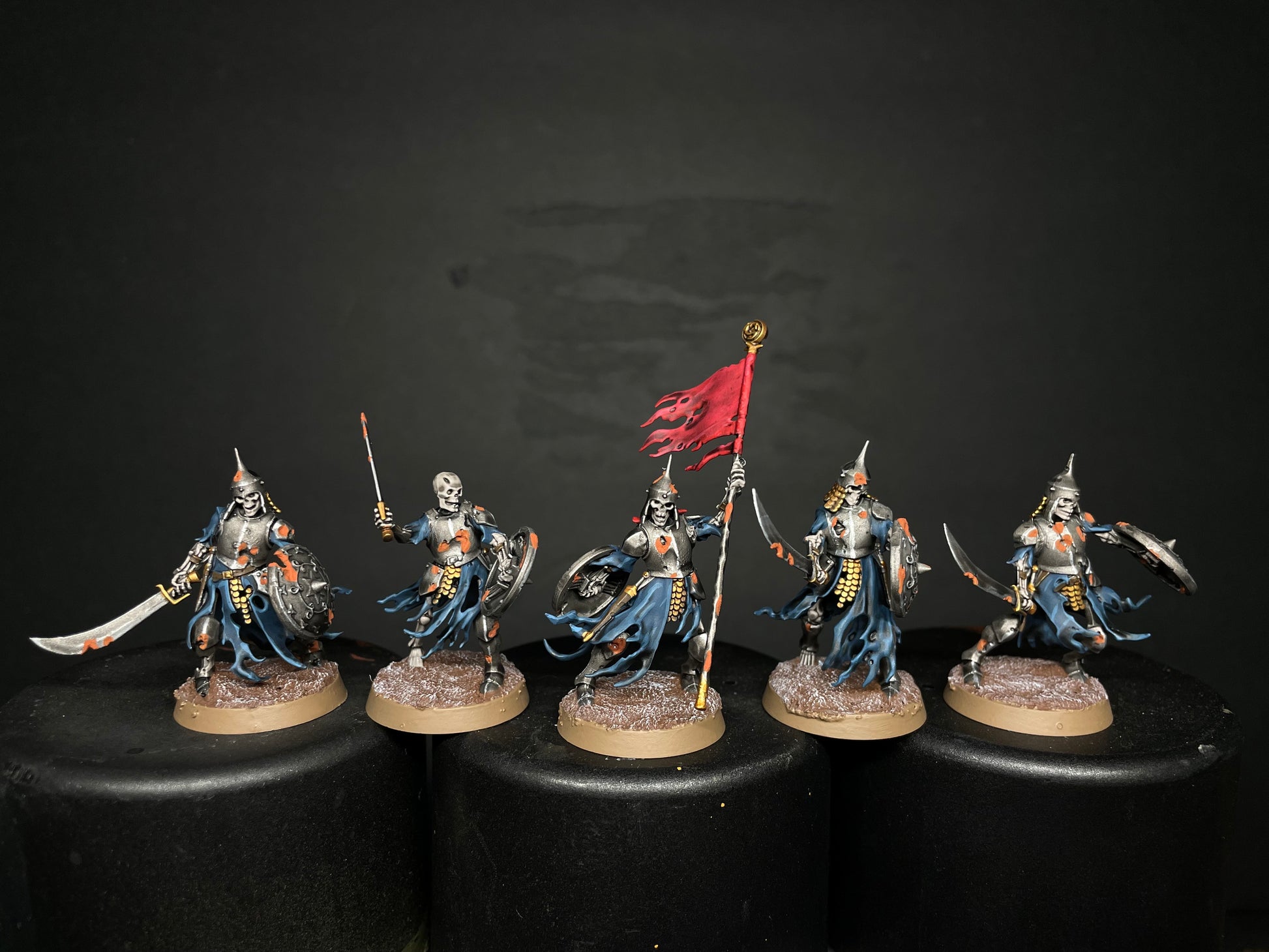 This is a fully painted & based set of 5 skeleton warriors manufactured by Games Workshop and painted by the Kingswood Customs studio. These models are 28mm plastic models on round bases. Perfect for wargames, D&D, or to display, these models are painted at a high standard and will be sure to impress anyone who views them.